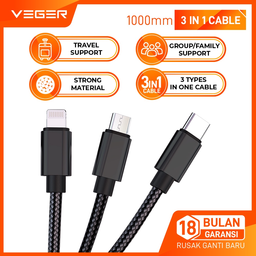 VEGER Kabel Cable Charger 3IN1 USB Micro + Type C + Lightning 100cm dijual oleh toko Veger Official Shop yang berlokasi di KOTA JAKARTA UTARA.