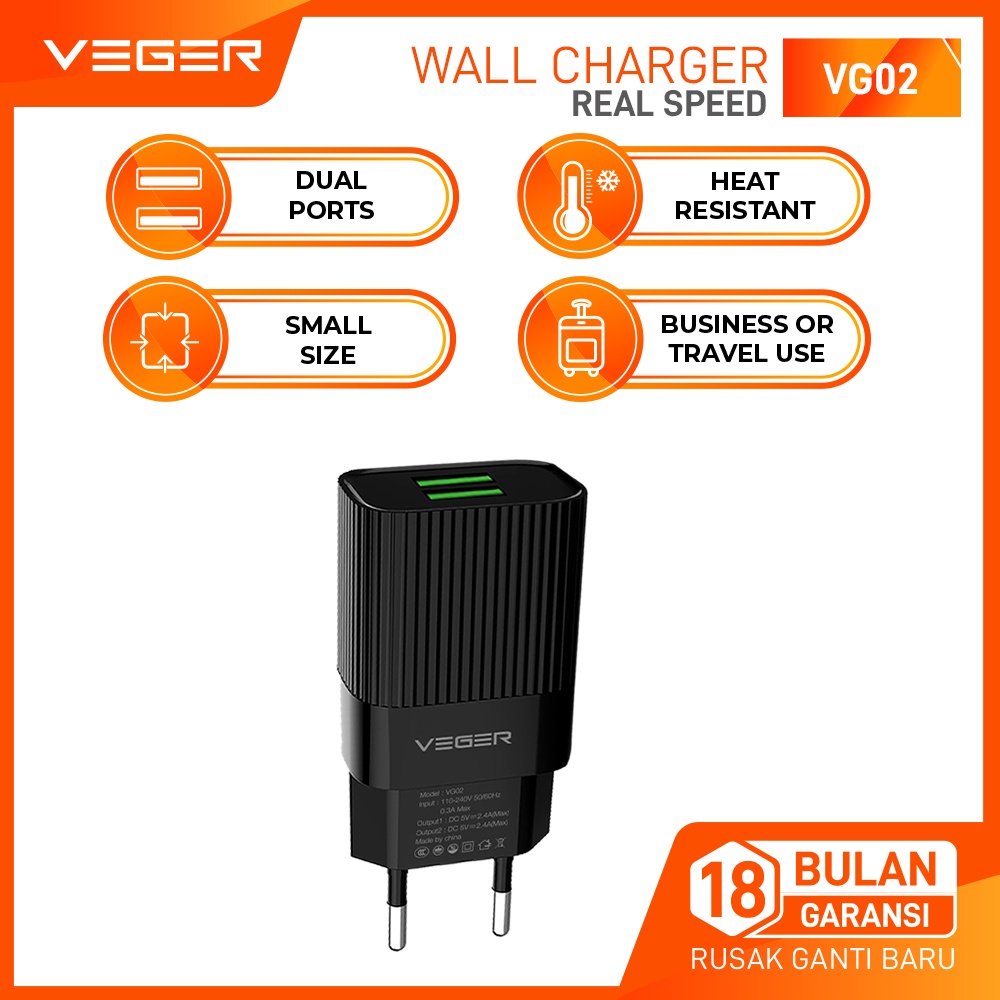 VEGER Wall Charger VG02 2 Ports USB Output 2.4A dijual oleh toko Veger Official Shop dengan lokasi KOTA JAKARTA UTARA.